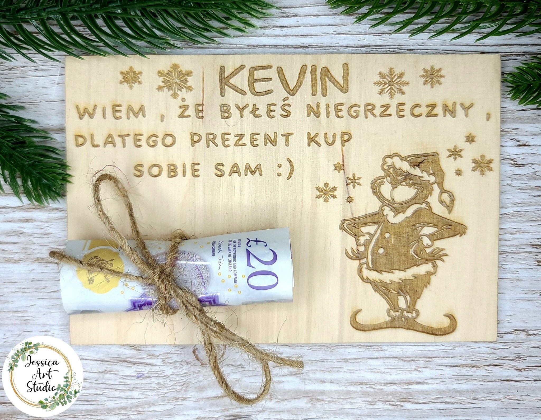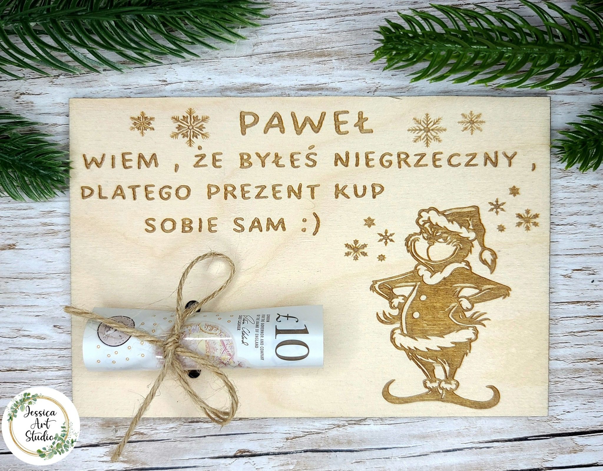Nasza grawerowana drewniana tabliczka z motywem Grinch to oryginalny pomysł na wręczenie gotówki w absolutnie wyjątkowy sposób.