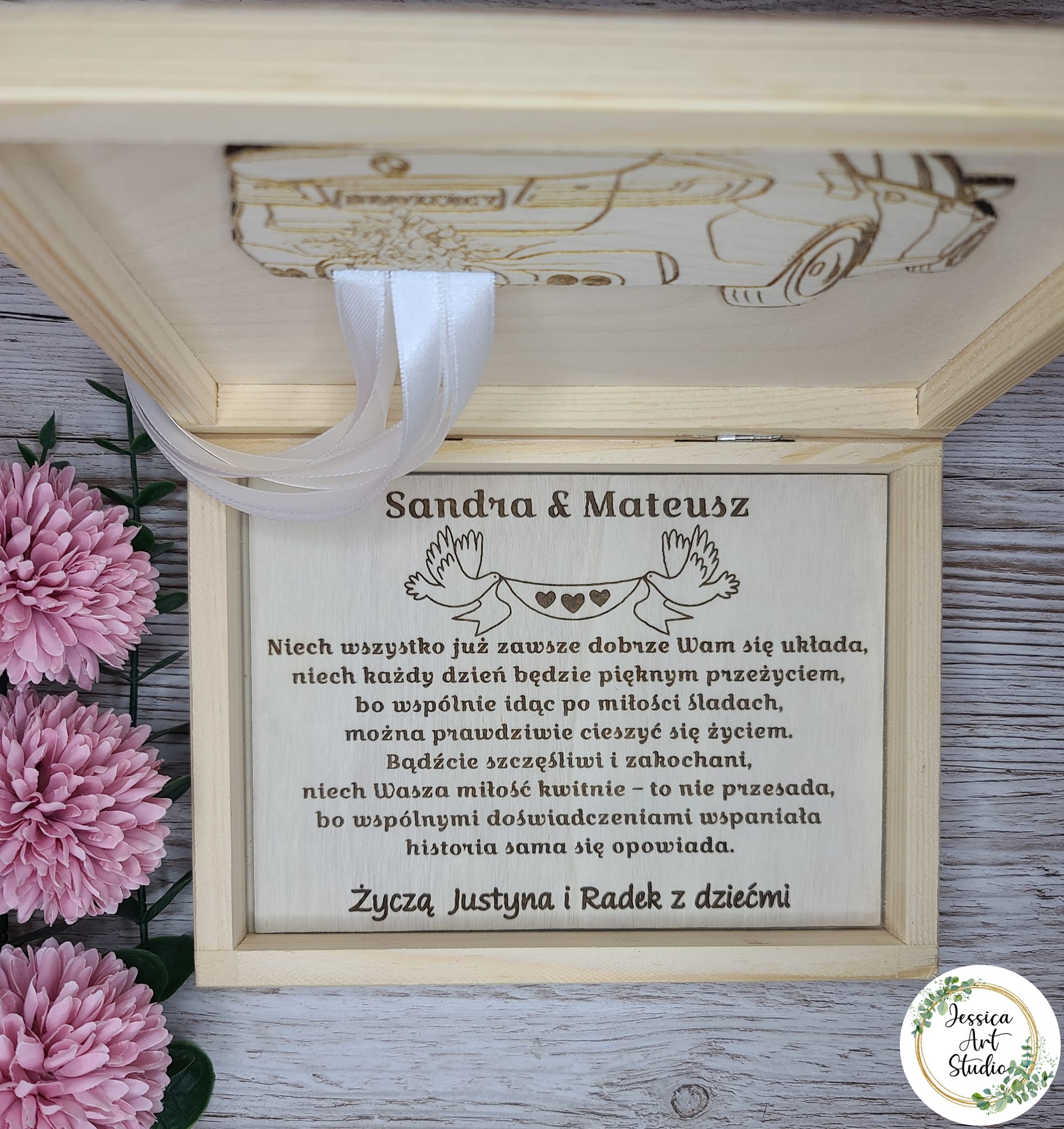 Pudełko możesz dowolnie spersonalizować – dodaj imiona, datę Ślubu, dedykację lub własne życzenia.