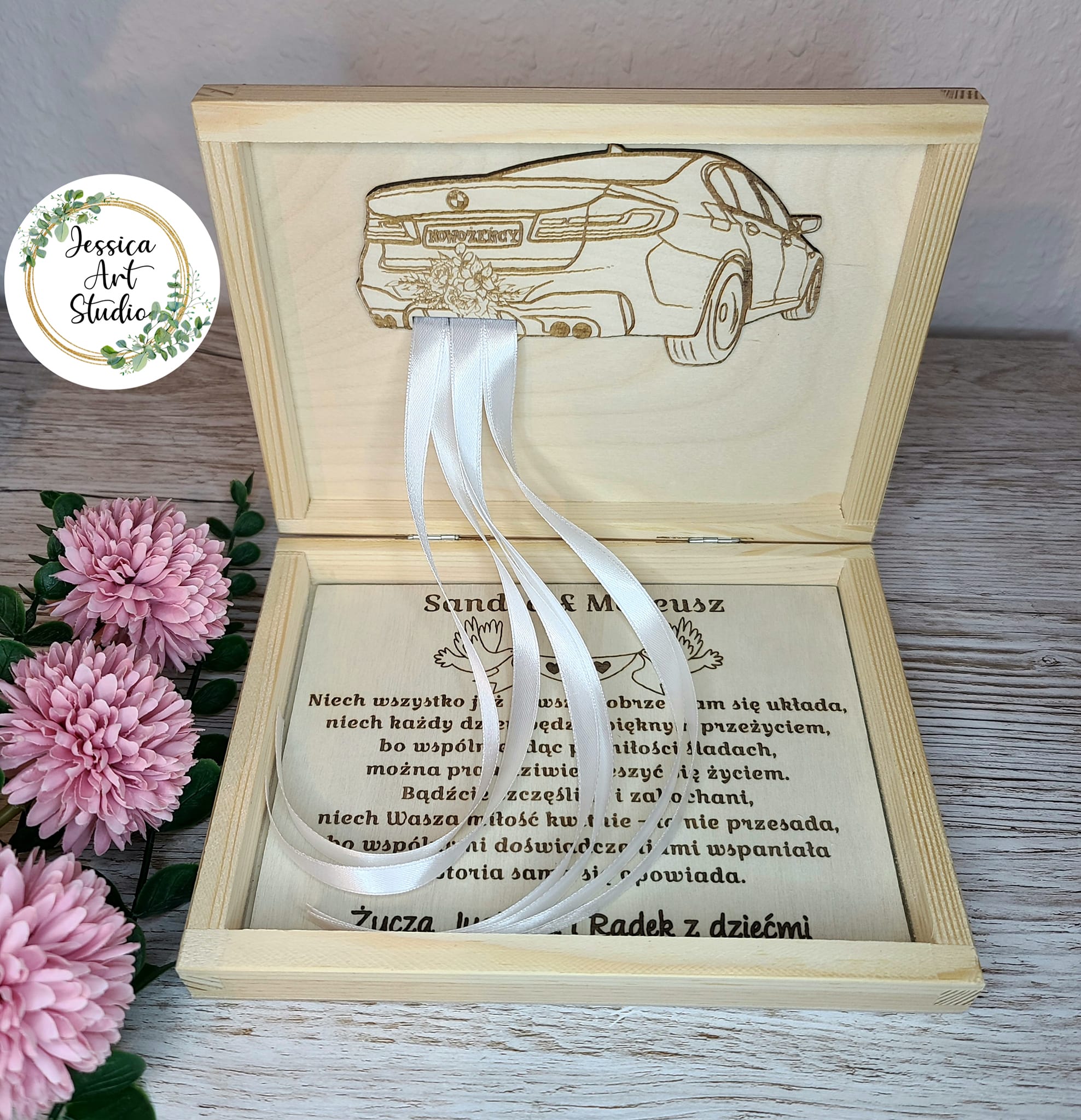 Wewnątrz znajduje się drewniany samochód Ślubny, od którego odchodzą delikatne wstążki – idealne do przywiązania banknotów 💸. Całość tworzy niezwykle romantyczną i symboliczną kompozycję – jak podróż przez wspólne życie pełne miłości i szczęścia.