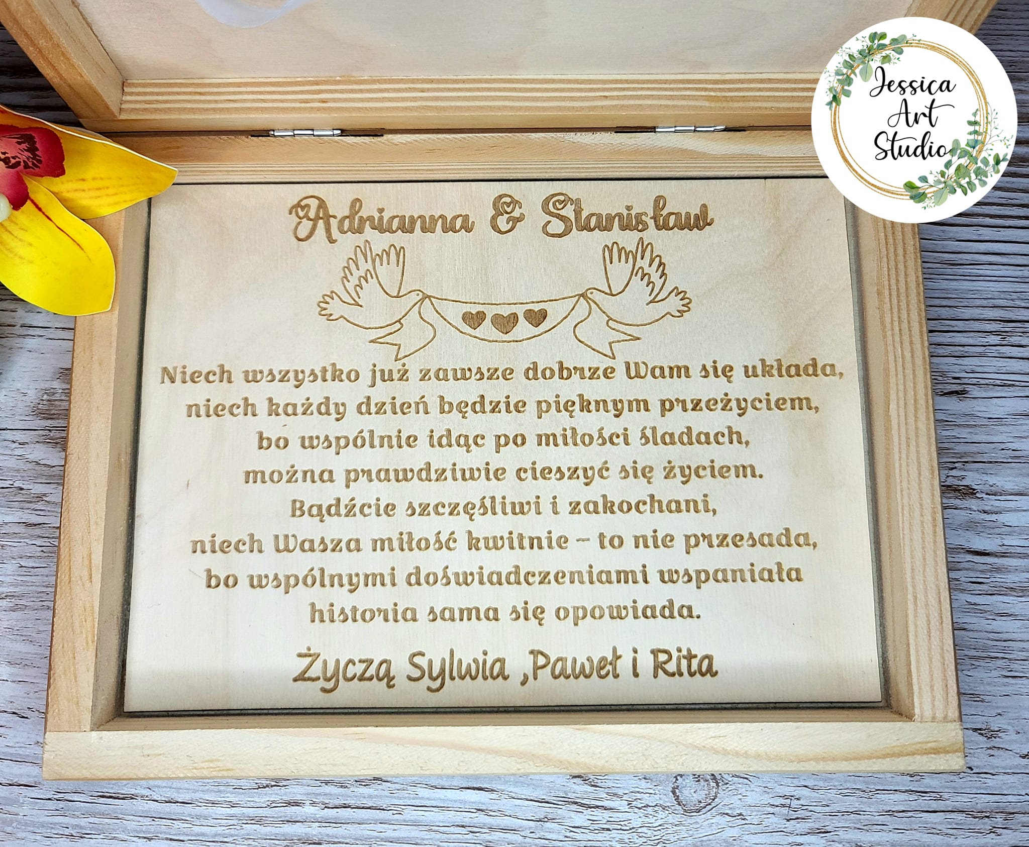 Nasze drewniane pudełko Ślubne z personalizacją to nie tylko piękne opakowanie, ale i pamiątka, która zostanie z Nowożeńcami na długie lata.