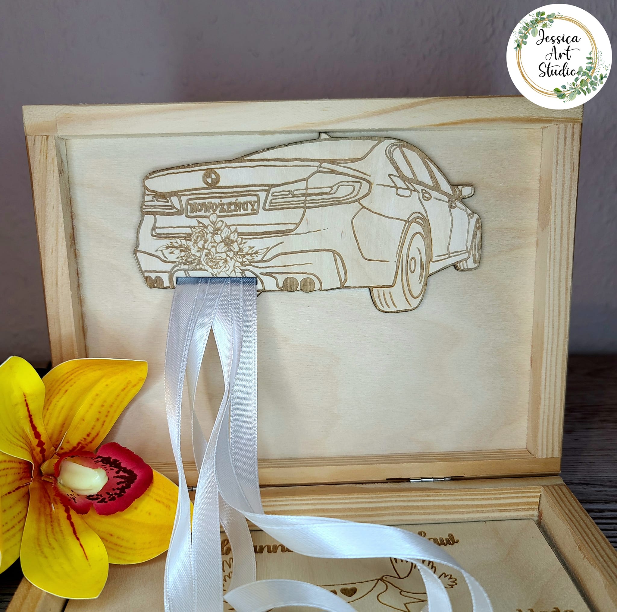 Wewnątrz znajduje się drewniany samochód Ślubny, od którego odchodzą delikatne wstążki – idealne do przywiązania banknotów 💸. Całość tworzy niezwykle romantyczną i symboliczną kompozycję – jak podróż przez wspólne życie pełne miłości i szczęścia.
