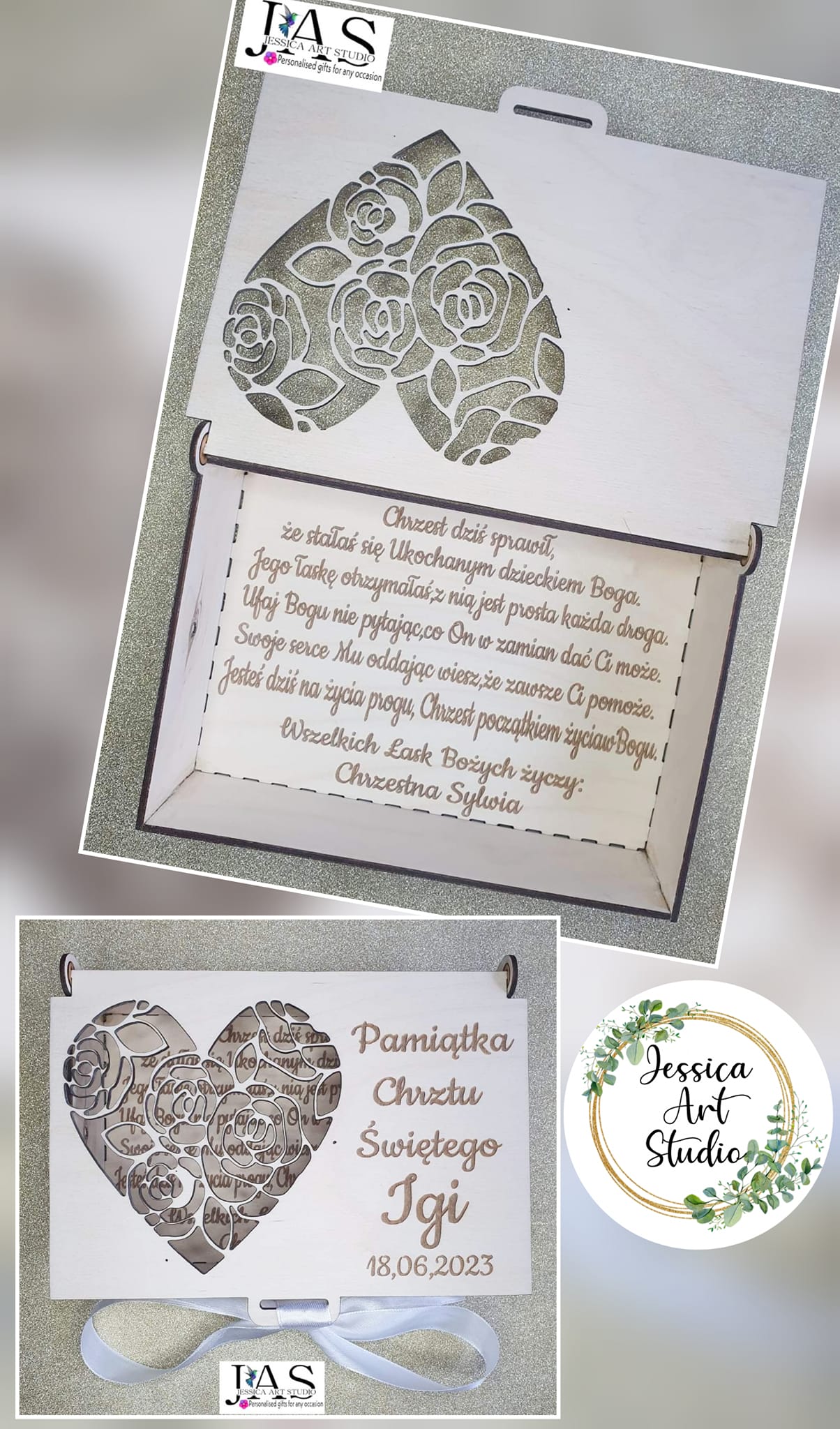 Wymiary i cena: 19 x 13 x 2,5 cm Każda pamiątka może zawierać dowolny tekst, imię dziecka i datę Chrztu, tworząc piękny, trwały upominek, który zostanie w rodzinie na lata.