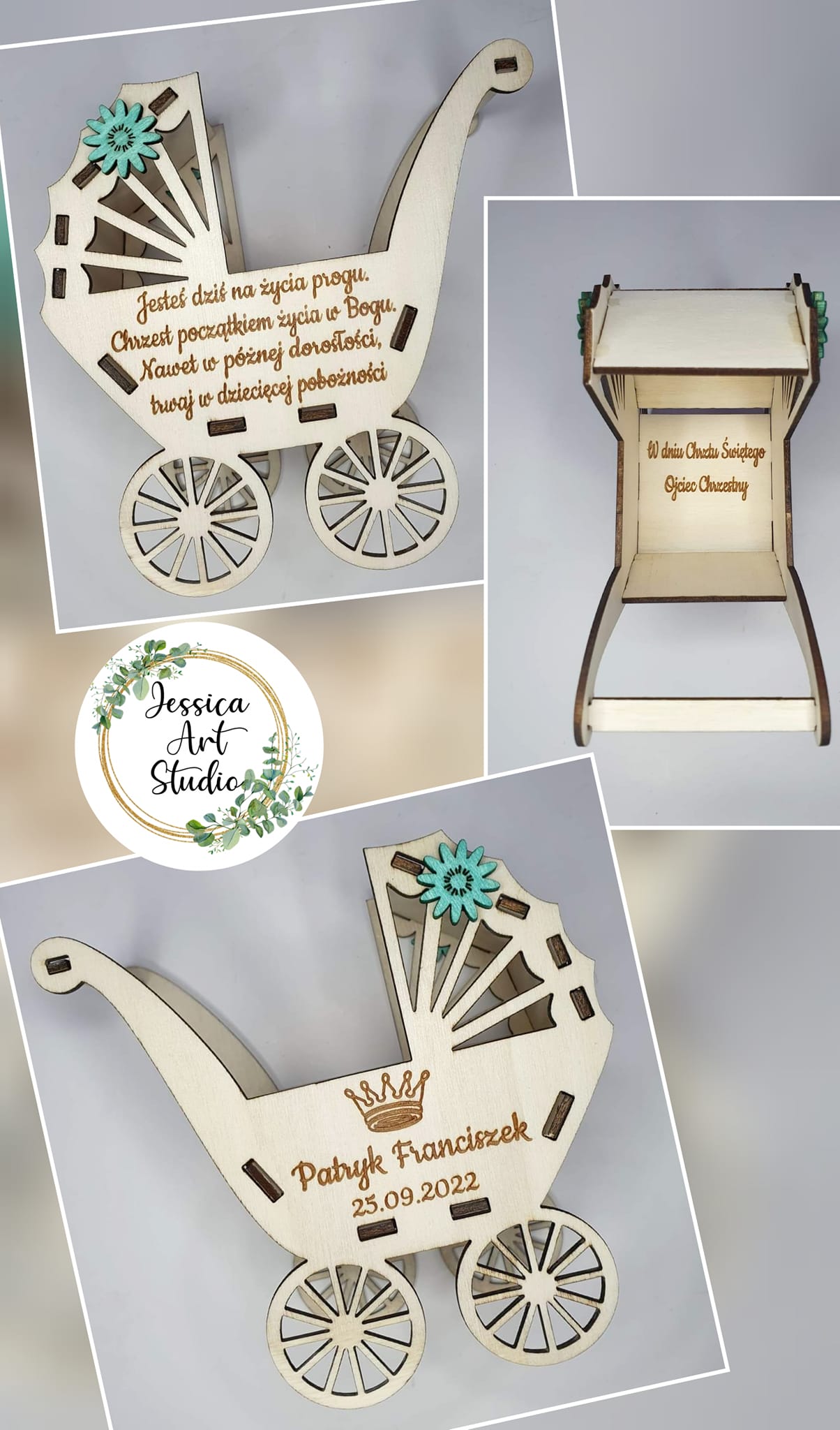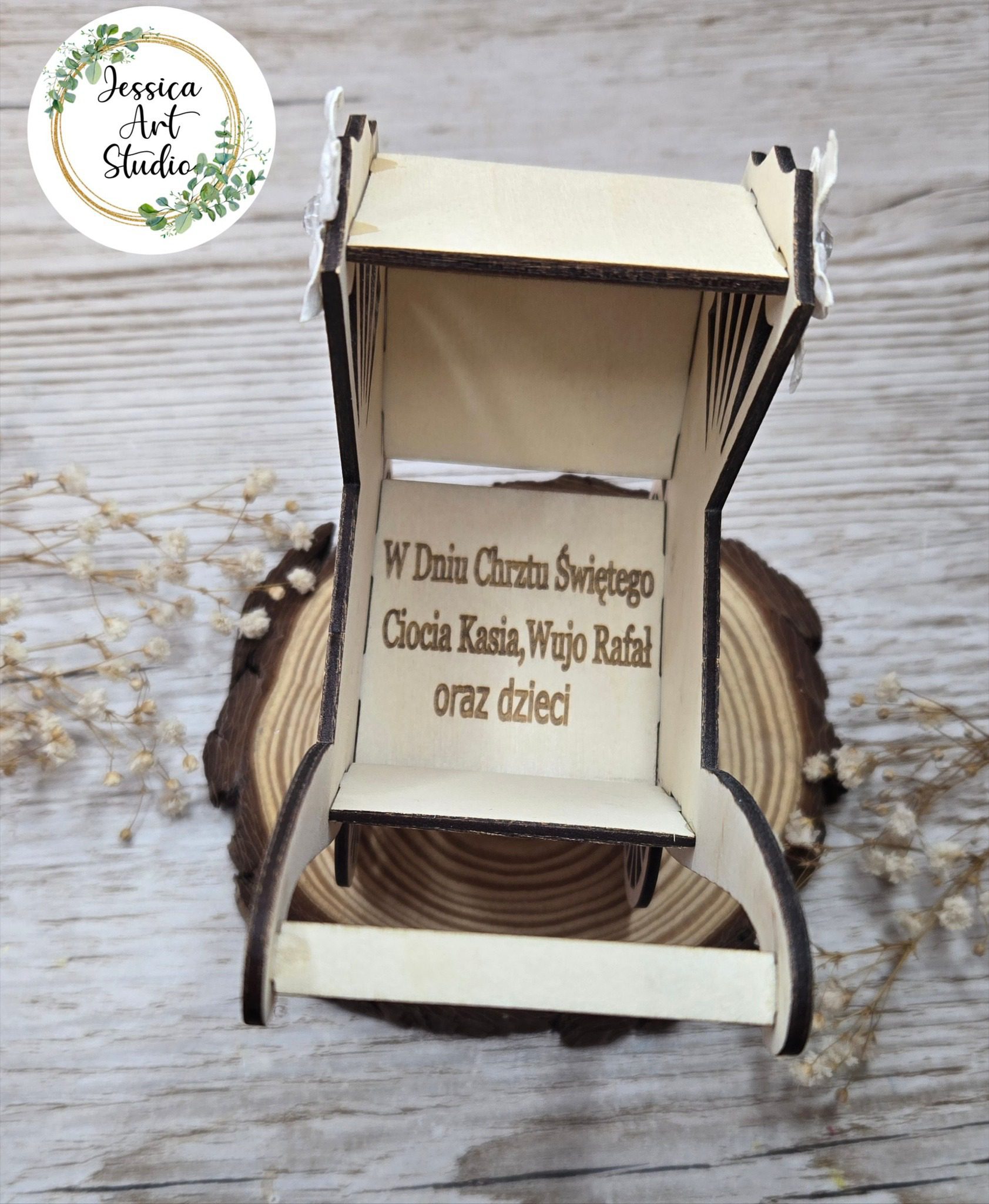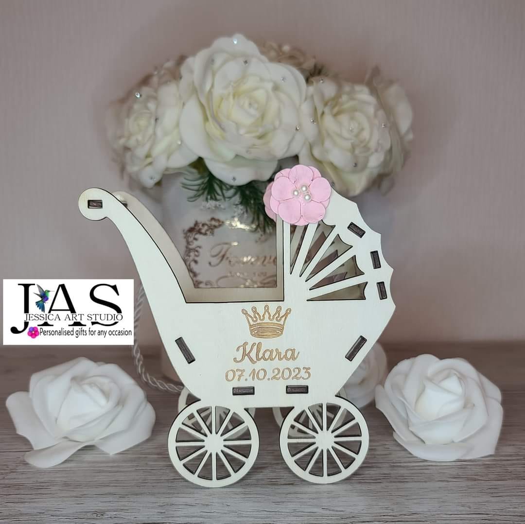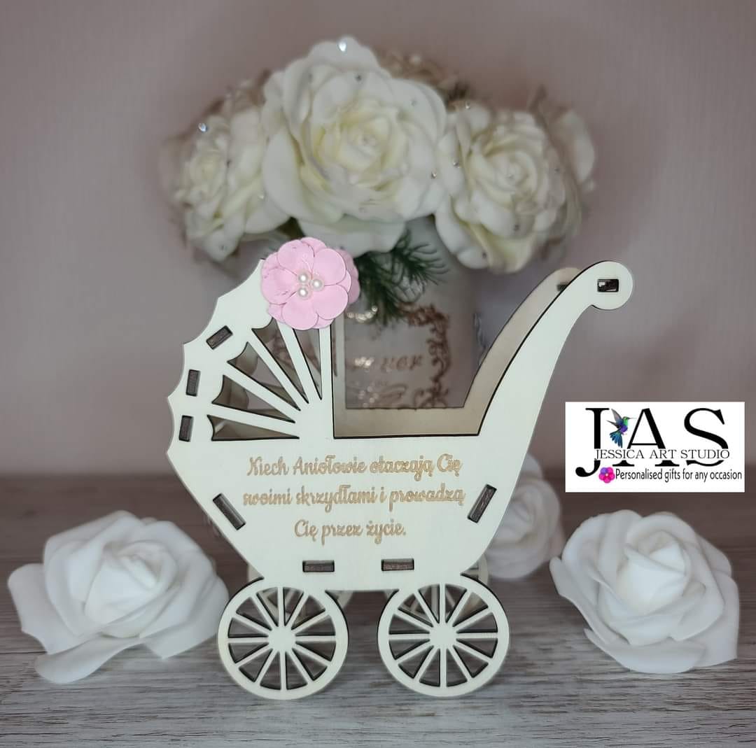 Ten uroczy drewniany wózek – symbol dziecięcej niewinności i miłości – to ręcznie wykonana pamiątka Chrztu, stworzona z pasją i dbałością o każdy detal.