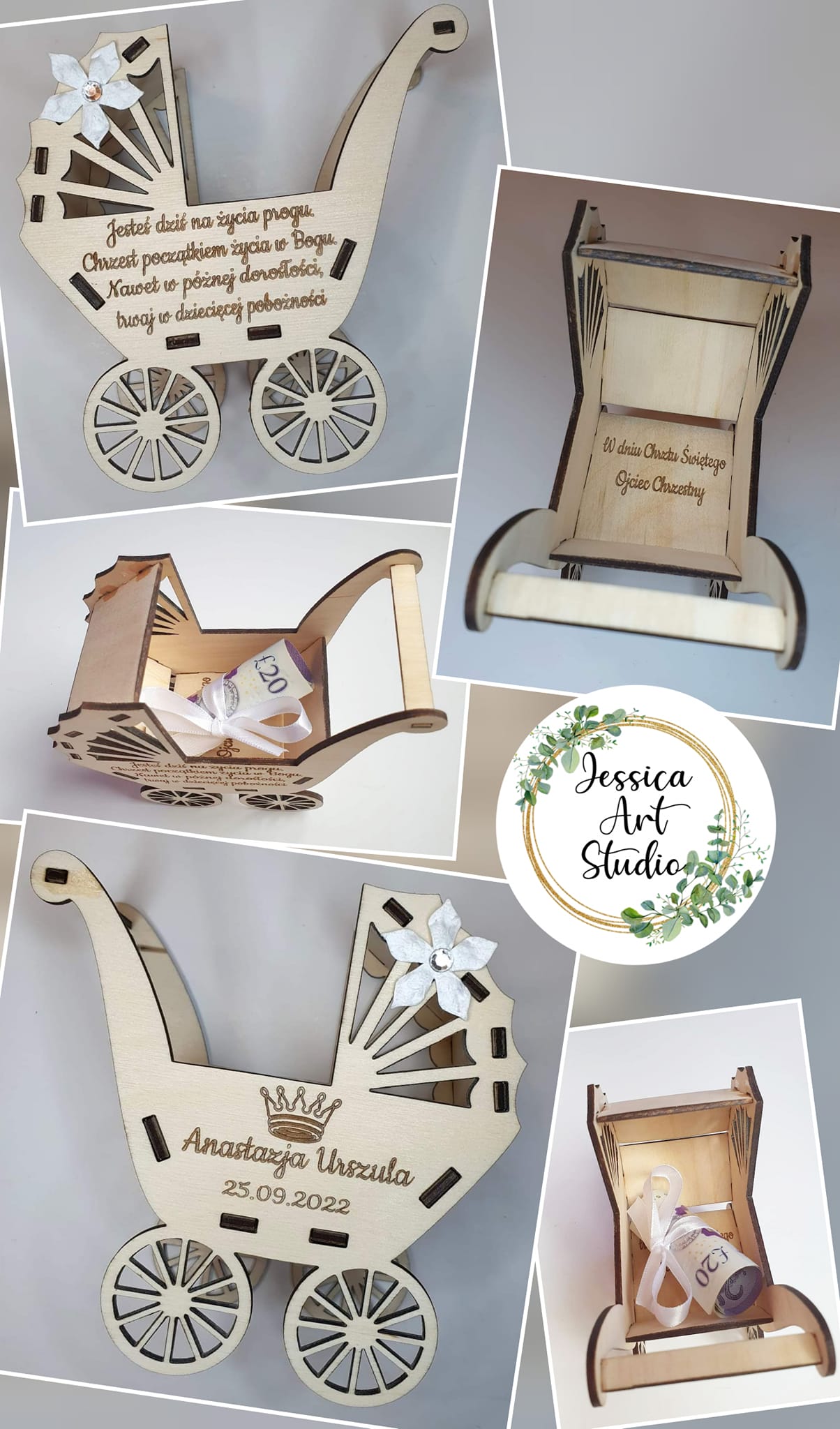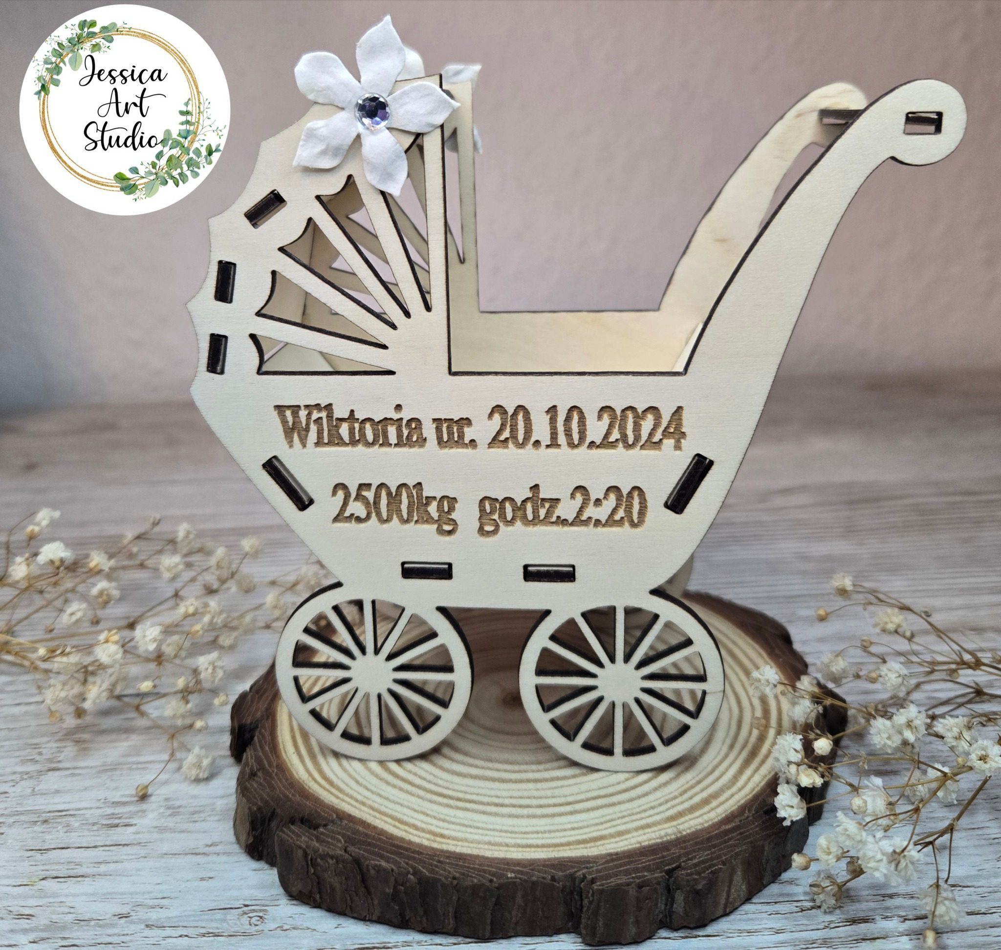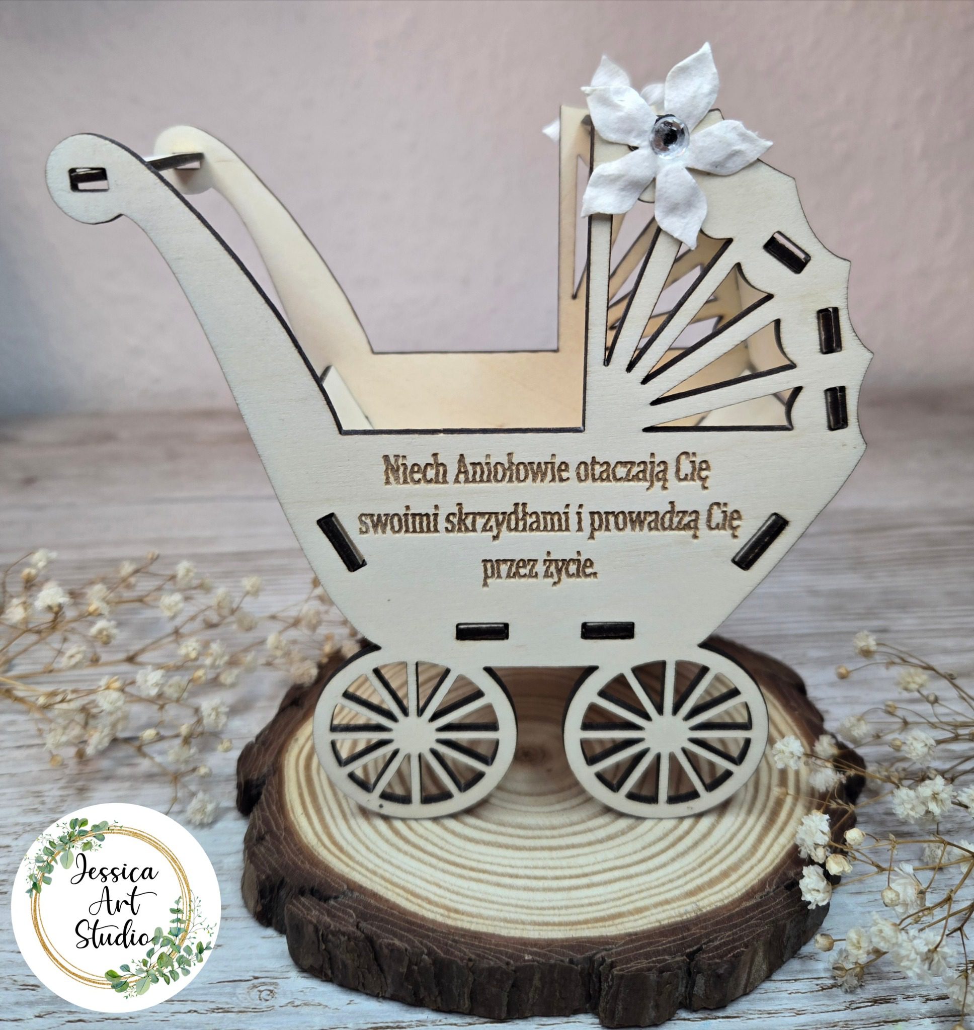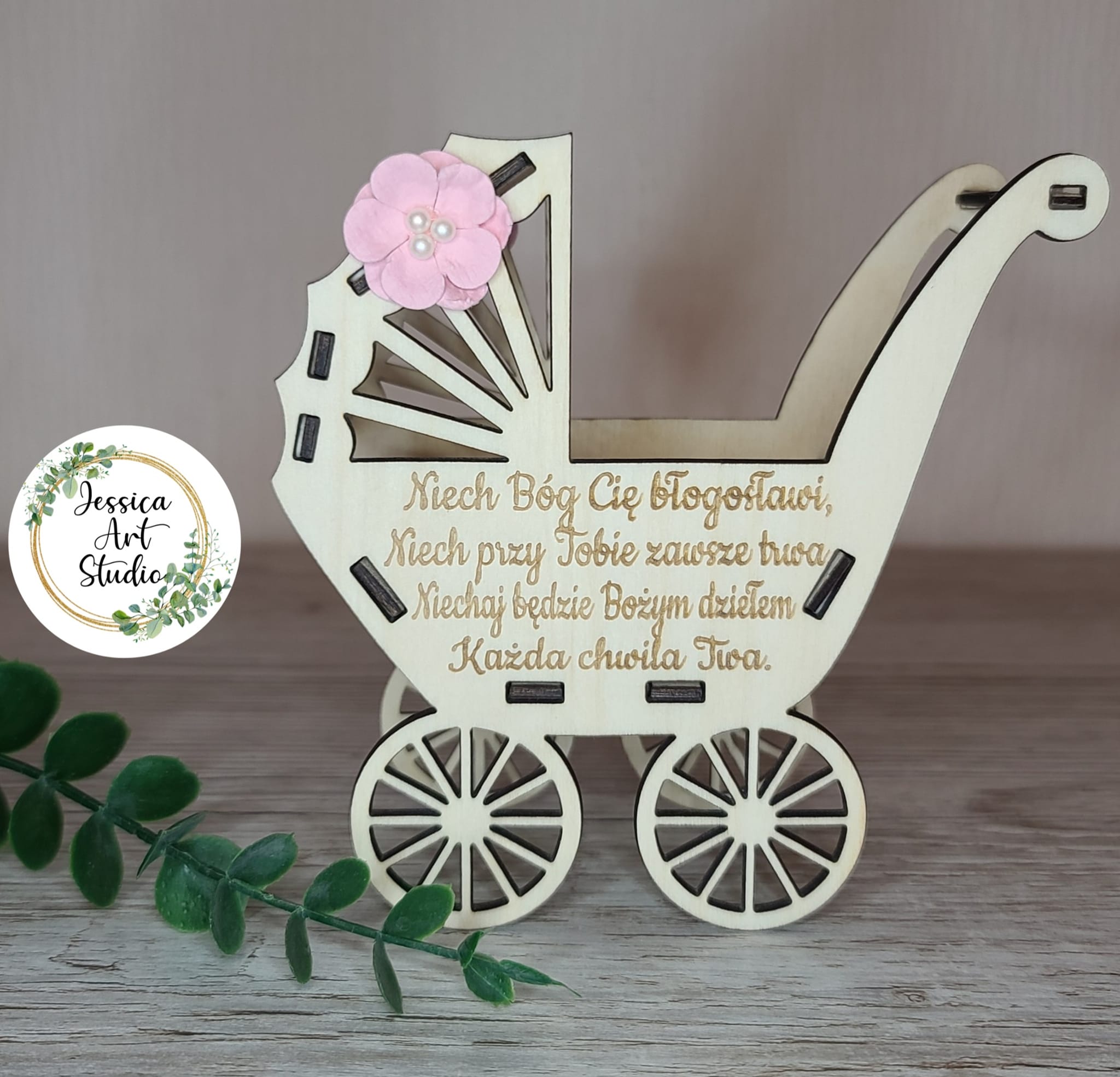 Ten uroczy drewniany wózek – symbol dziecięcej niewinności i miłości – to ręcznie wykonana pamiątka Chrztu, stworzona z pasją i dbałością o każdy detal.