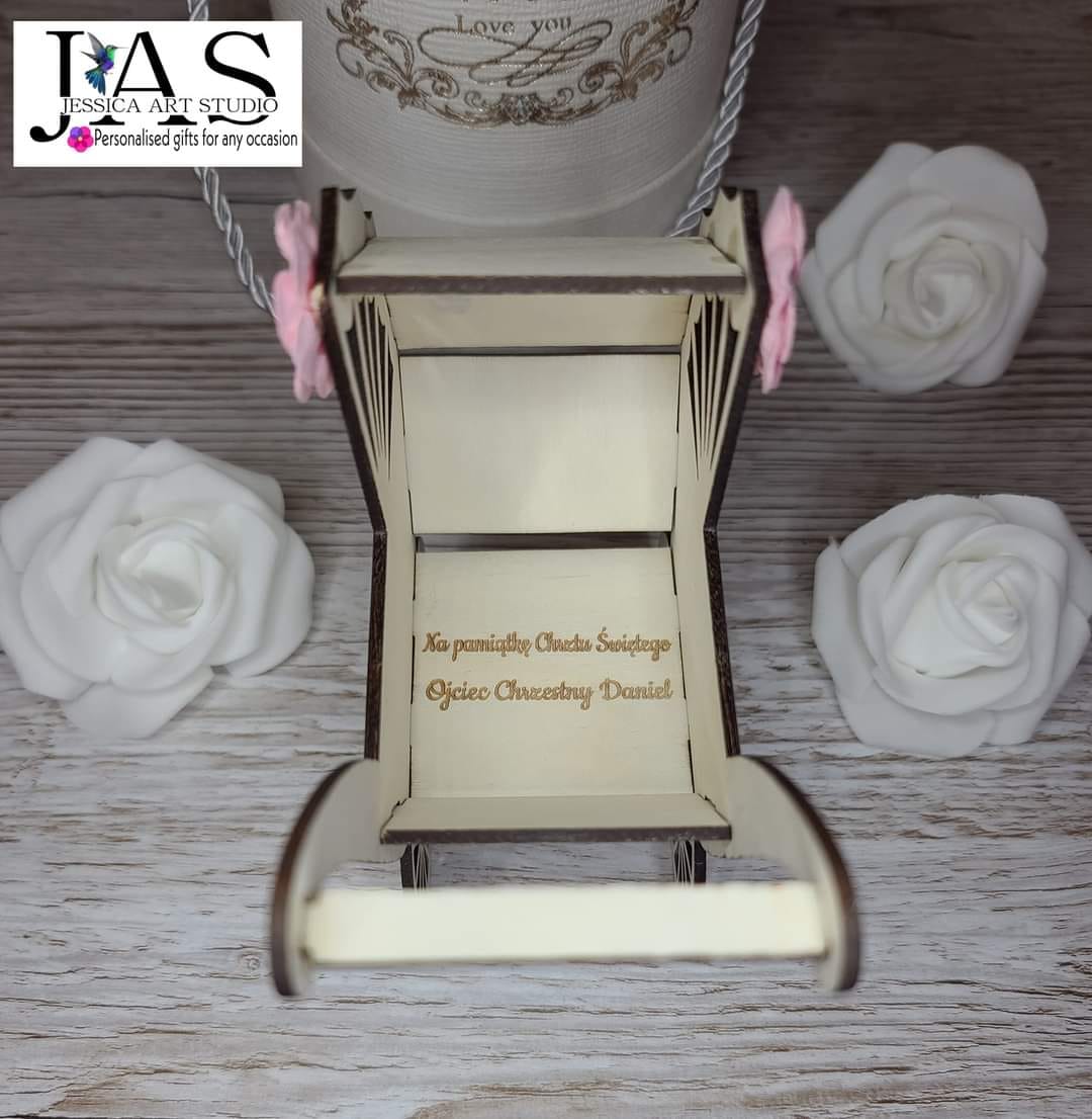👶✨ Wyjątkowa Pamiątka Chrztu Świętego – Ręcznie Wykonany Drewniany Wózek z Personalizacją ✨