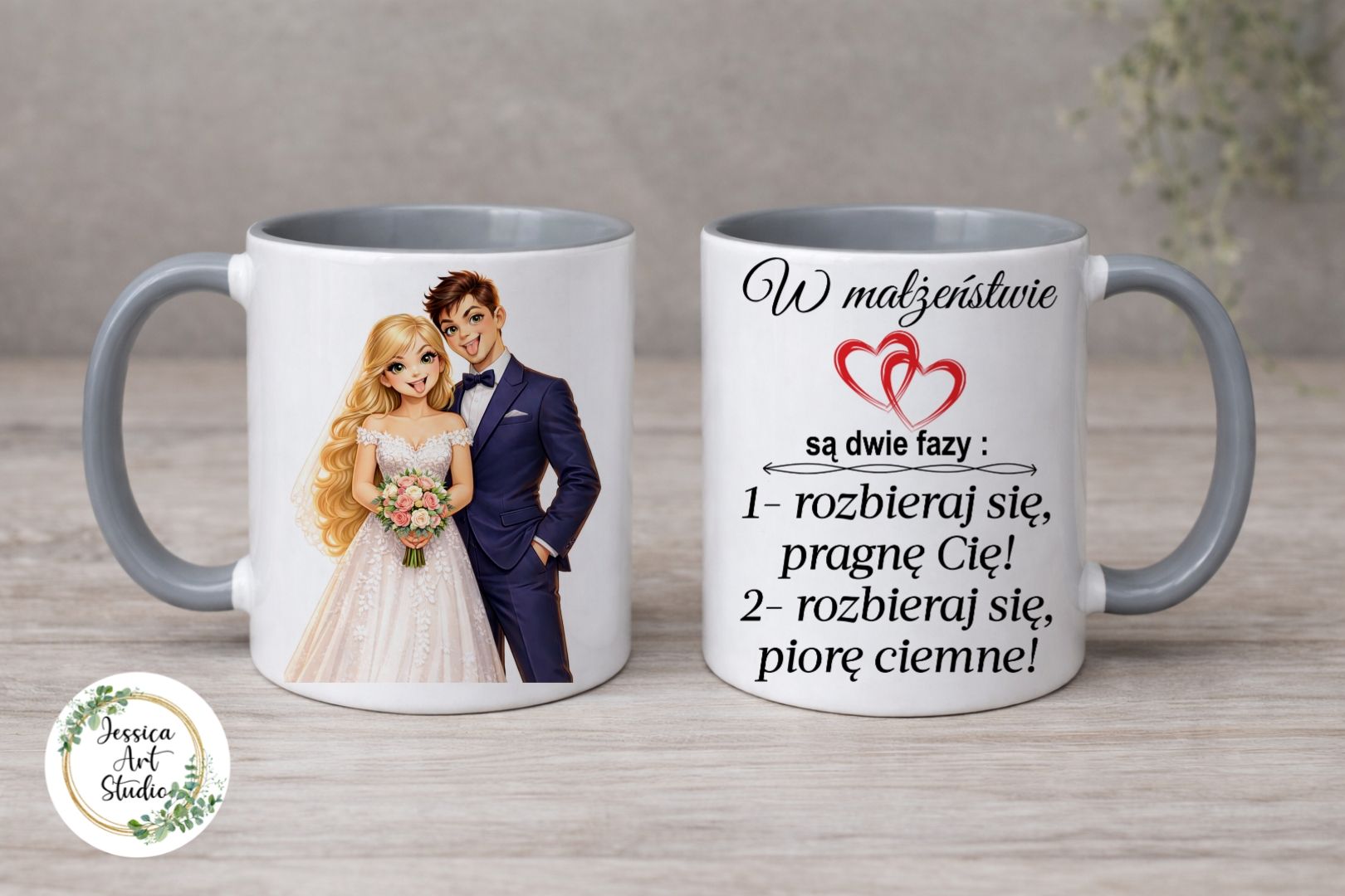 Urocza grafika zakochanej pary zderza się tu z tekstem, który doskonale oddaje codzienność po ślubie – bo w małżeństwie naprawdę są dwie fazy… i każda ma swoje „argumenty”
