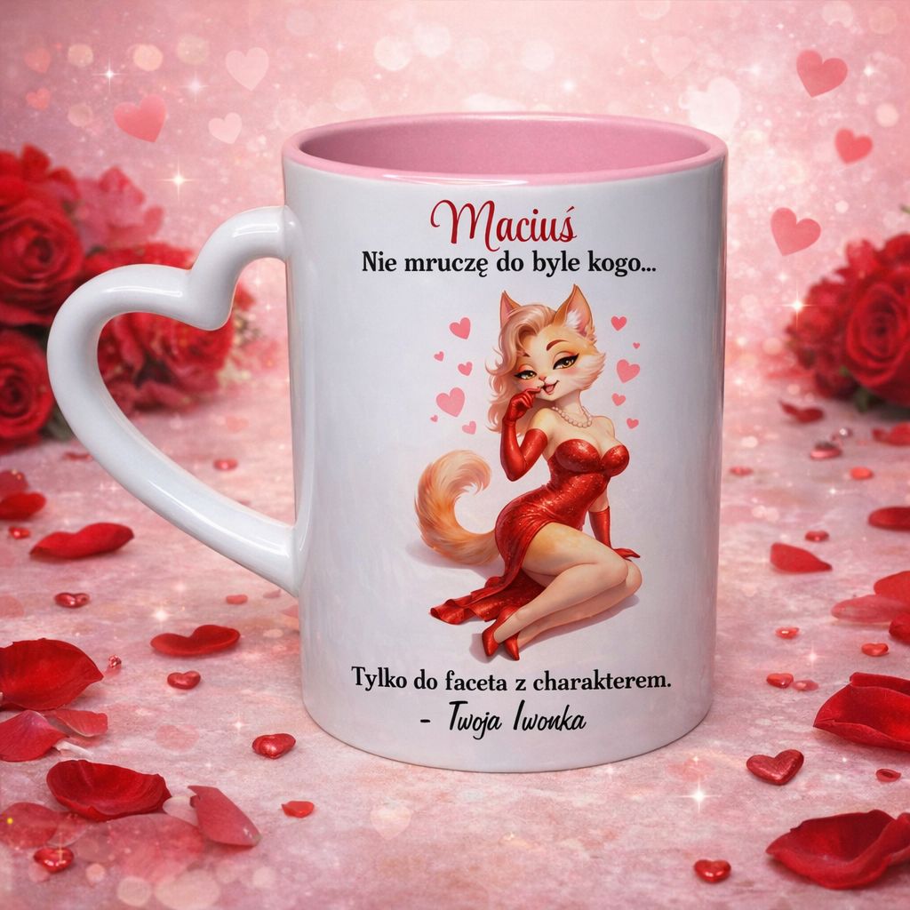 Ten kubek to zabawny i lekko pikantny prezent, który od razu poprawia humor. Sexy kotka, walentynkowe serduszka i tekst z przymrużeniem oka jasno pokazują, że to upominek tylko dla faceta z charakterem. Idealny na poranną kawę lub herbatę, która smakuje jeszcze lepiej, gdy towarzyszy jej uśmiech. Personalizacja imieniem i podpisem sprawia, że kubek staje się wyjątkową pamiątką i świetnym prezentem na Walentynki lub bez okazji.