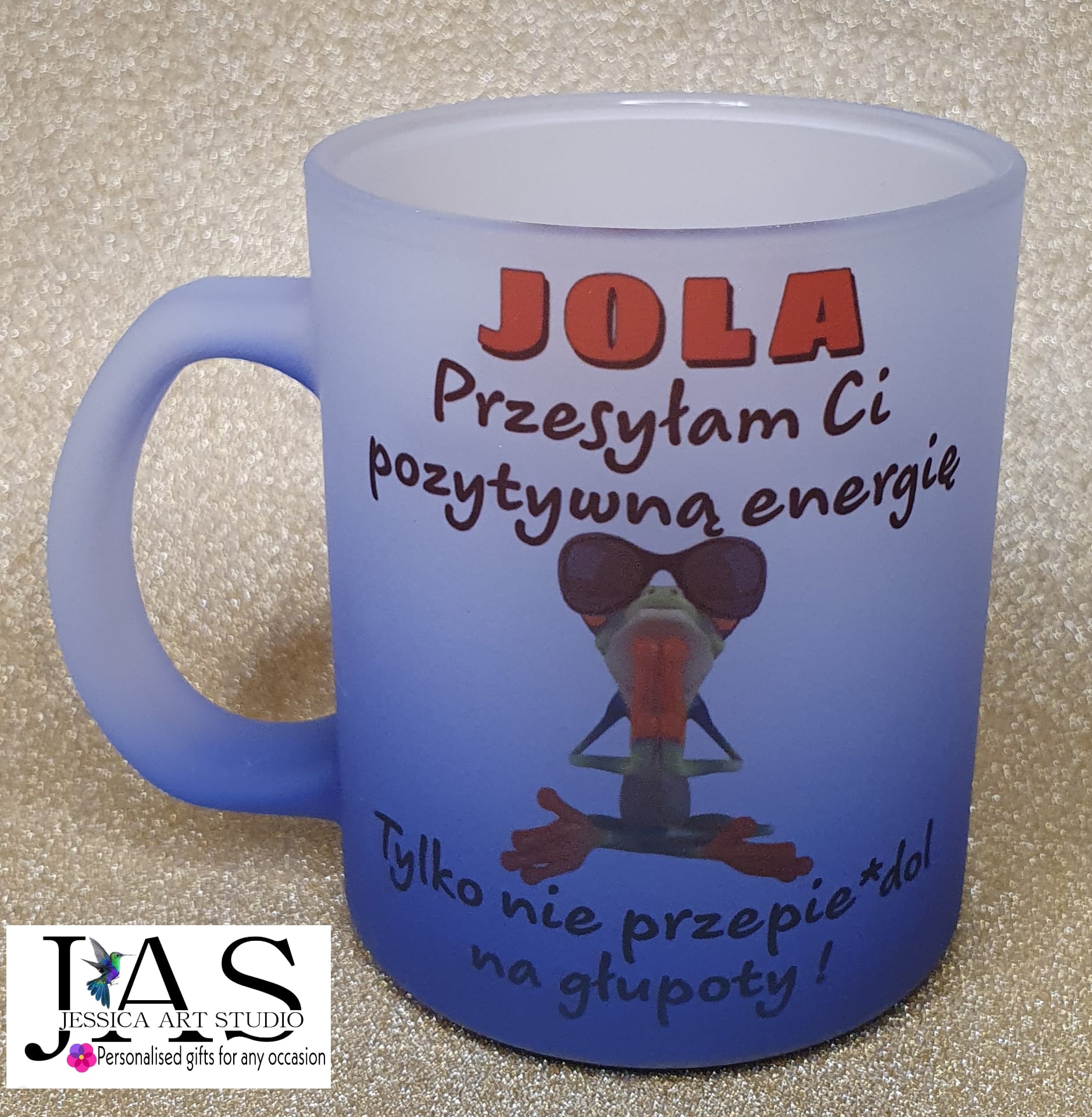 Na froncie znajduje się zabawny nadruk z medytującą żabą, a całość uzupełnia personalizowany napis z imieniem, dzięki czemu kubek staje się niepowtarzalny i pełen charakteru.