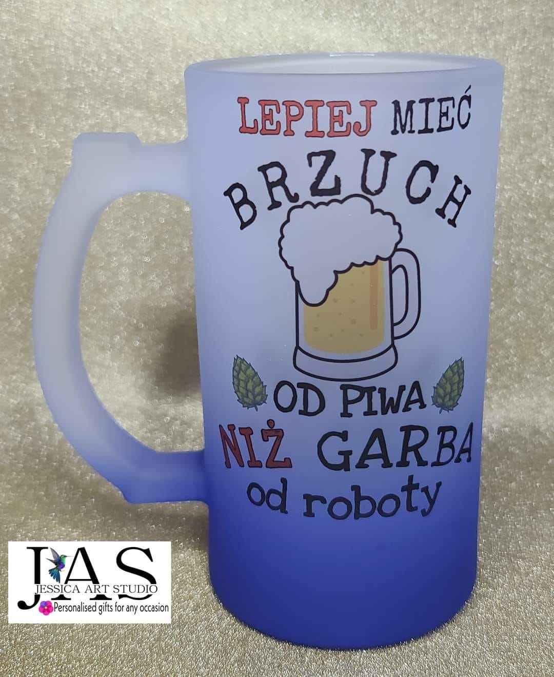 Z zabawnym nadrukiem przypominającym, że lepiej mieć brzuch od piwa niż garba od roboty, każdy łyk staje się okazją do śmiechu i relaksu. Stylowe matowe szkło i wesoły design sprawiają, że kufel świetnie nadaje się na urodziny, imprezę czy spontaniczny prezent dla faceta z dystansem i poczuciem humoru.