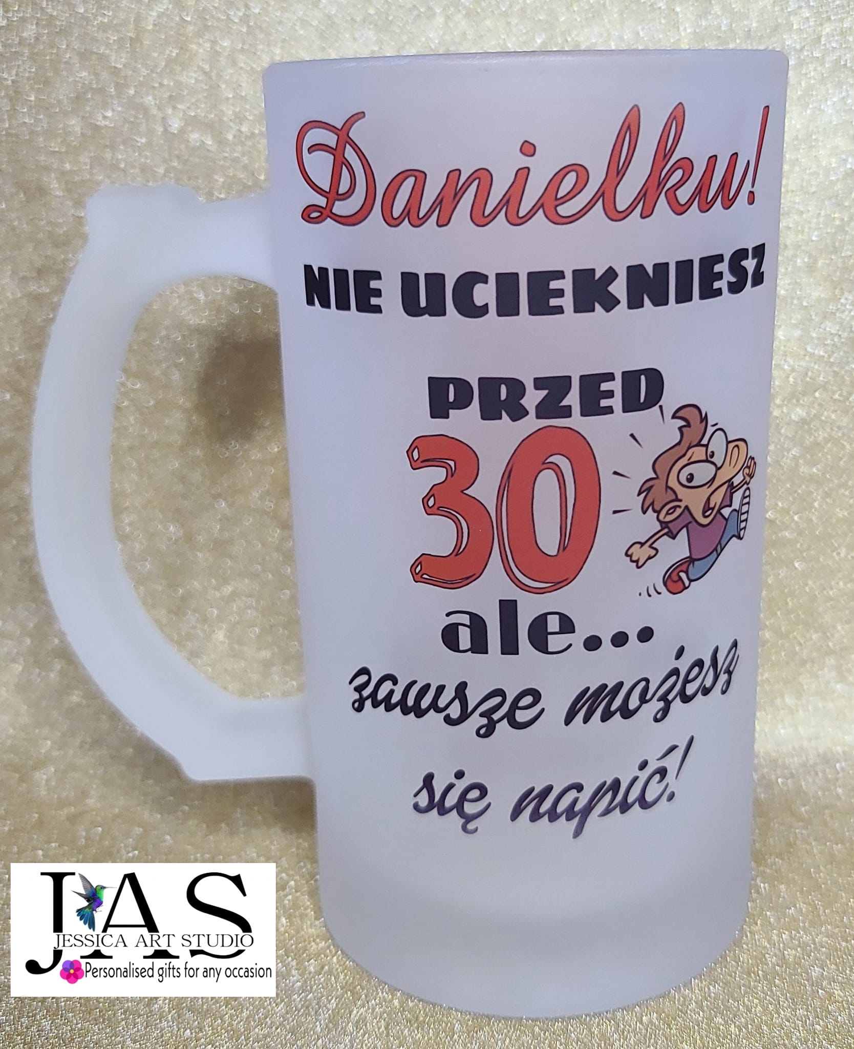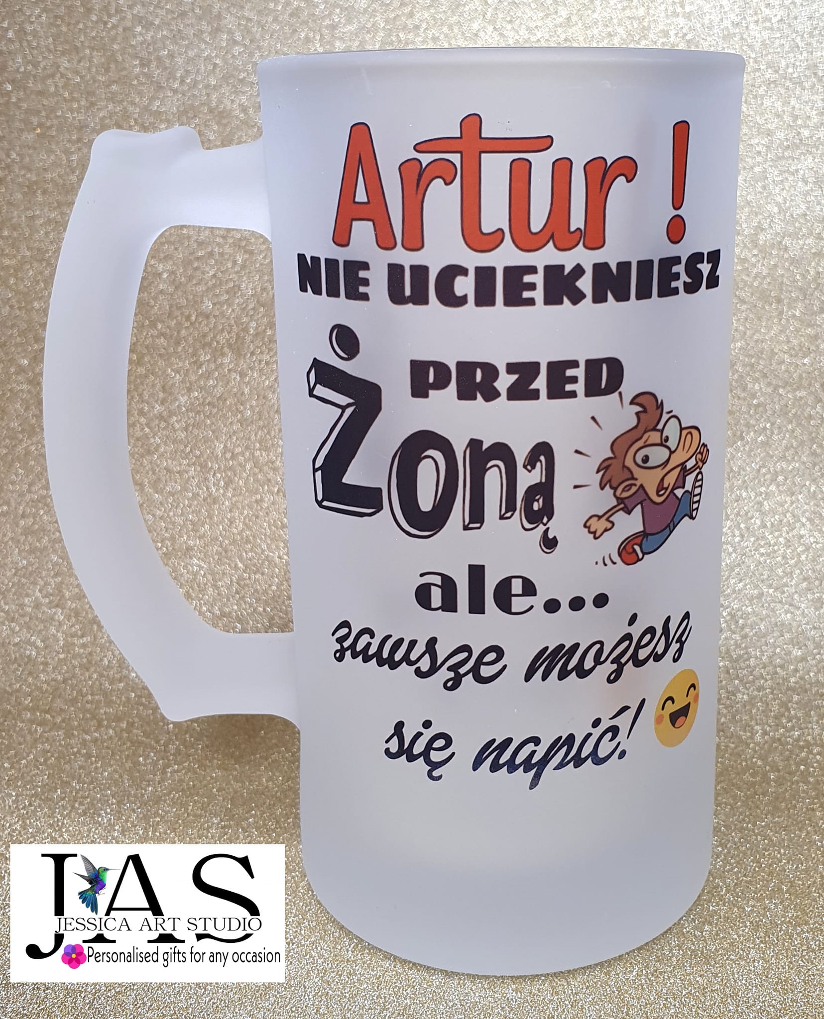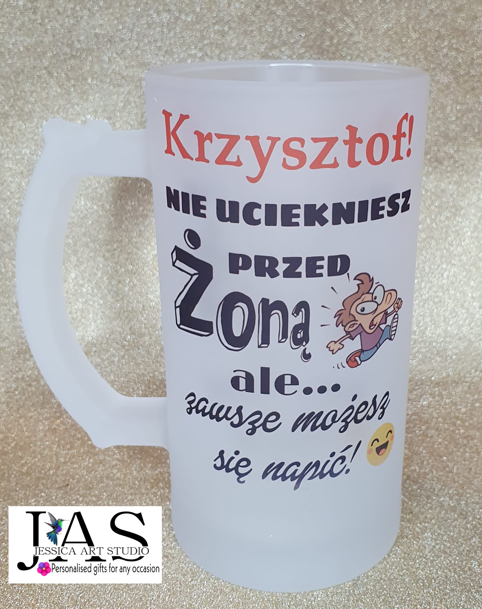 Ten kufel to idealny prezent dla każdego, kto z humorem podchodzi do urodzin, rocznicy czy codziennych wyzwań! 🍻 Dzięki personalizacji możesz zmienić imię oraz „przed czym lub przed kim” ktoś chciałby uciec, tworząc zabawny, wyjątkowy nadruk dopasowany do obdarowywanej osoby. Matowe szkło wygląda stylowo, a trwały nadruk gwarantuje uśmiech przy każdym łyku. To prezent, który łączy praktyczność z poczuciem humoru i zawsze trafia w punkt! 😄