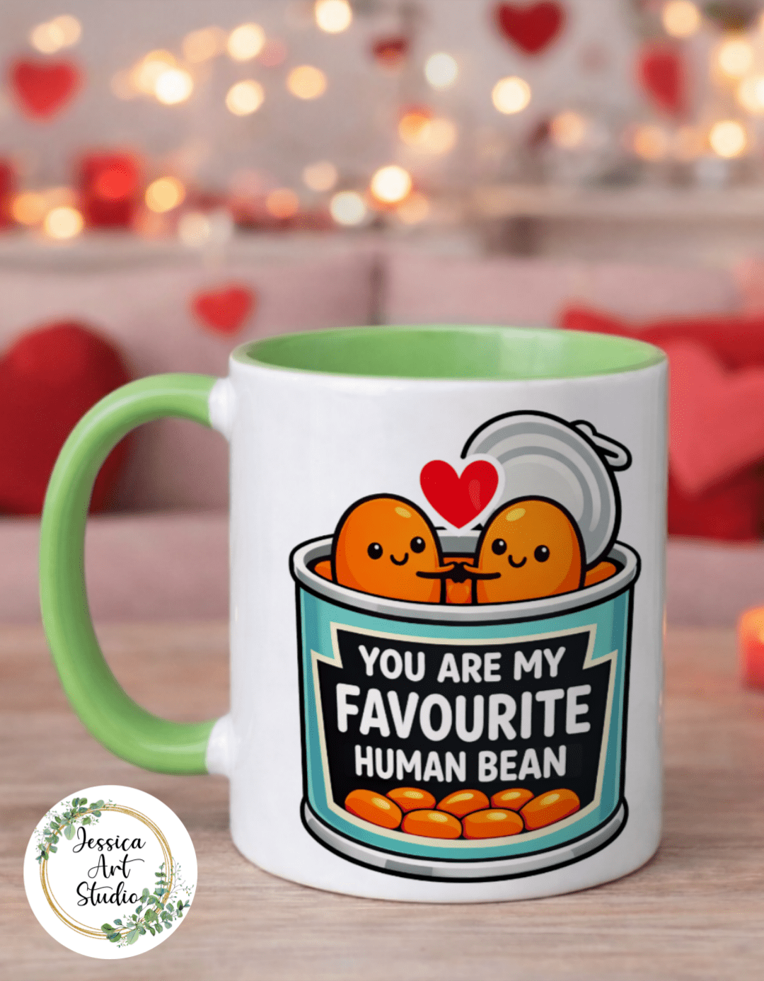 This personalised funny love mug is the perfect way to show someone special just how much they mean to you. Featuring adorable smiling beans and the sweet message “You Are My Favourite Human Bean”, this mug combines humour and romance in one charming design. Whether it’s for your partner, boyfriend, girlfriend, husband or wife, this cute mug makes every coffee or tea break extra special. It’s a thoughtful and light-hearted gift that brings smiles every day and reminds your loved one that they are truly your favourite human. Ideal as a Valentine’s Day gift, anniversary present, birthday surprise or simply a spontaneous gesture of love, this mug is designed to be used daily. The high-quality print ensures vibrant colours and lasting durability, making it both practical and meaningful. Perfect for morning coffees, evening teas or cosy moments together, this funny love mug turns ordinary drinks into sweet memories. A small gift with a big emotional impact – because love is best served with a smile.