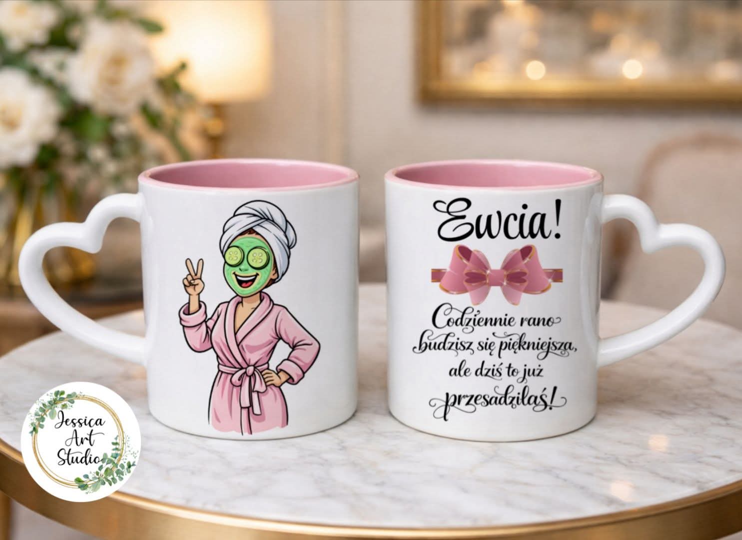 Personalised Funny Spa Mug – Cute Girl Design with Polish Quote Add a smile to someone’s morning routine with this adorable personalised funny spa mug. Featuring a cute illustrated girl in a bathrobe with a face mask and a playful Polish quote, this mug is perfect for anyone who loves humour, self-care vibes and cosy coffee moments. This charming ceramic mug comes with a heart-shaped handle and soft pink interior, making it not only practical but also beautifully stylish. It’s a lovely way to say “you’re amazing” with a touch of fun. Personalisation makes this mug extra special – a thoughtful keepsake that brings joy every single day. Whether it’s for your partner, best friend, sister, mum or colleague, this mug is guaranteed to raise a smile. Perfect as a gift for birthdays, Valentine’s Day, anniversaries, Women’s Day or simply as a sweet surprise without occasion. Each mug is printed with care in our studio to ensure vibrant colours and long-lasting quality.