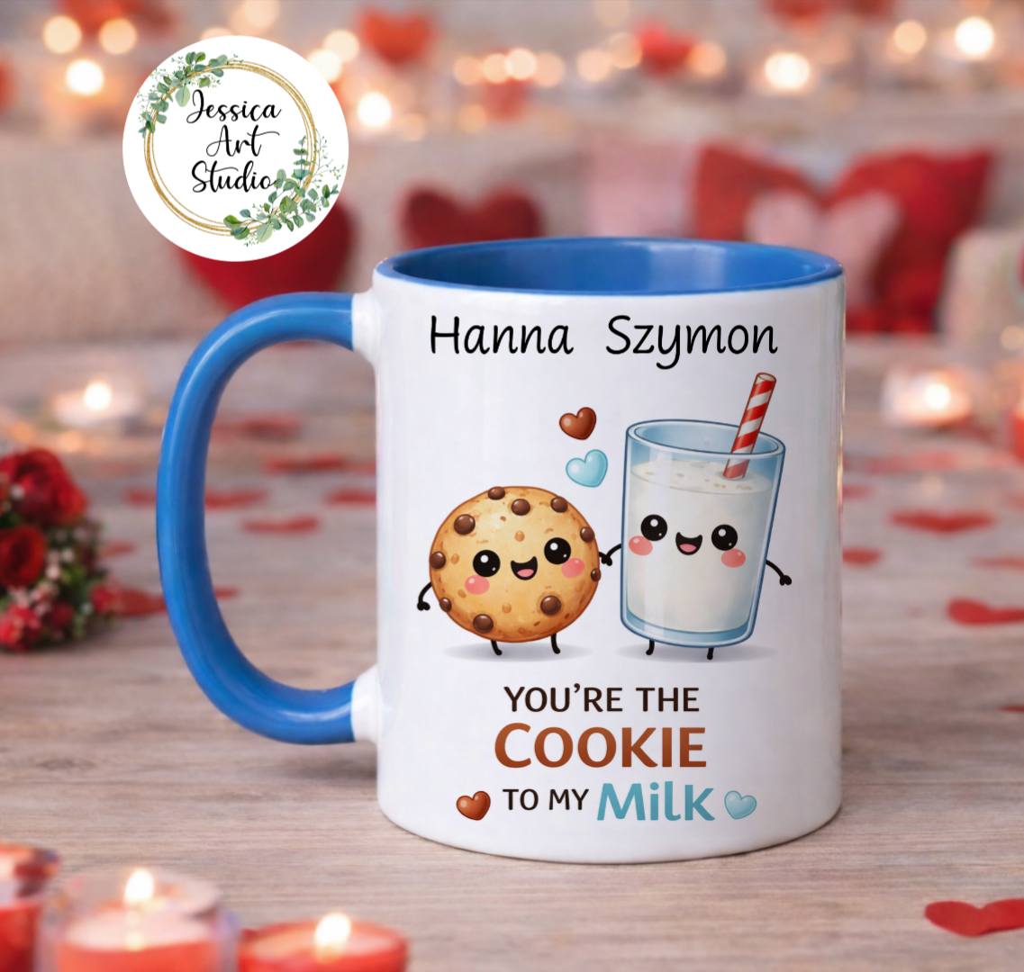 Whether it’s for your partner, girlfriend, boyfriend, husband, wife or favourite couple – this mug is guaranteed to warm hearts. Perfect for Valentine’s Day, anniversaries, birthdays or simply as a surprise “just because” gift, this personalised mug is both practical and sentimental. Every morning coffee or evening tea becomes a reminder of love and special memories. Each mug is made to order with great care and attention to detail. We personalise every design individually, making sure names are placed beautifully and printed clearly. The result is a high-quality mug that looks lovely and lasts. This personalised Valentine mug is not only romantic but also fun and modern. The cheerful characters and soft colours make it suitable for all ages and styles – from cute couples to long-term partners who enjoy a little humour in their gifts. Why you’ll love this mug: • Personalised with names of your choice • Cute cookie & milk couple design • High-quality ceramic mug • Durable print made for everyday use • Dishwasher safe (gentle wash recommended) • Perfect romantic gift idea • Handmade to order in the UK • UK delivery available This mug makes a wonderful gift for:
