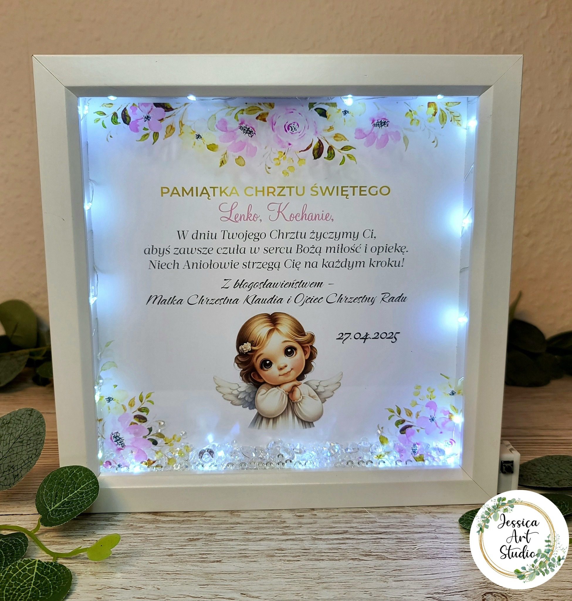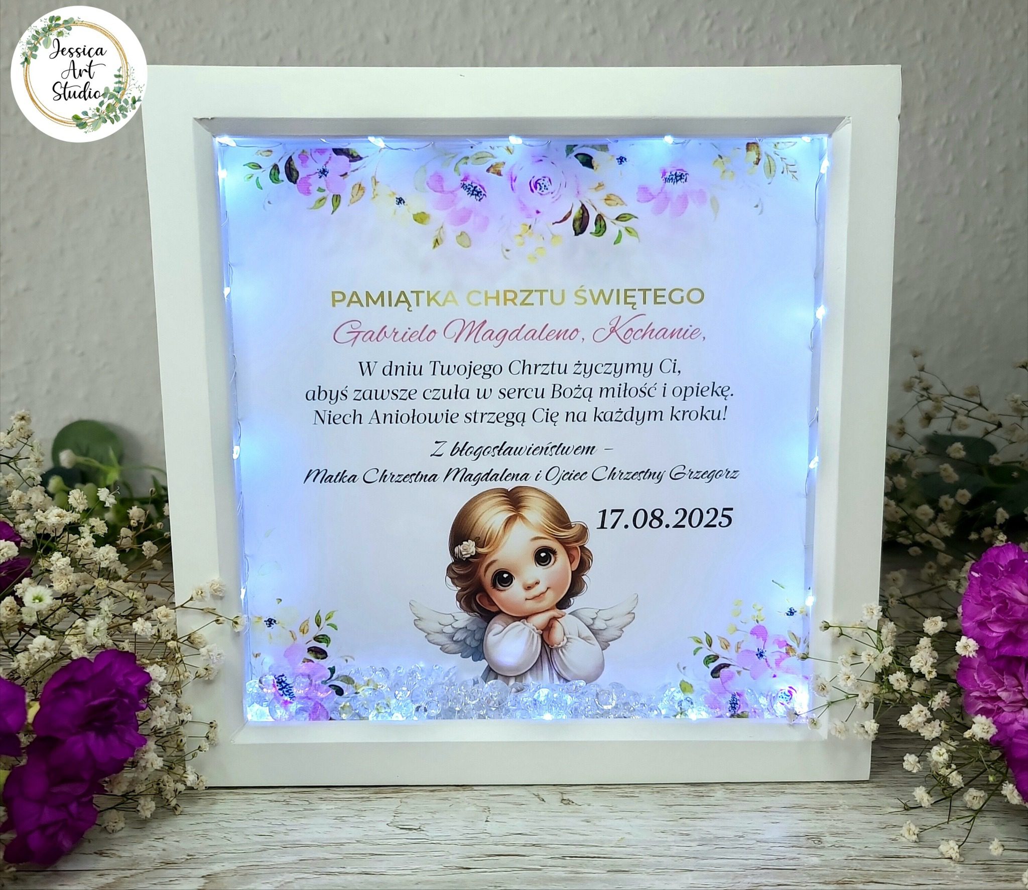 Każdy detal został zaprojektowany z myślą o tym, by uchwycić wyjątkowość dnia Chrztu Świętego – subtelne światło LED nadaje całości ciepły blask, a delikatne kryształki odbijają go jak promyki szczęścia. Dzięki personalizacji imieniem dziecka ramka staje się jedyna w swoim rodzaju, a jej wyjątkowy design z sercem i motywami anielskimi sprawia, że to pamiątka pełna symboliki i emocji.
