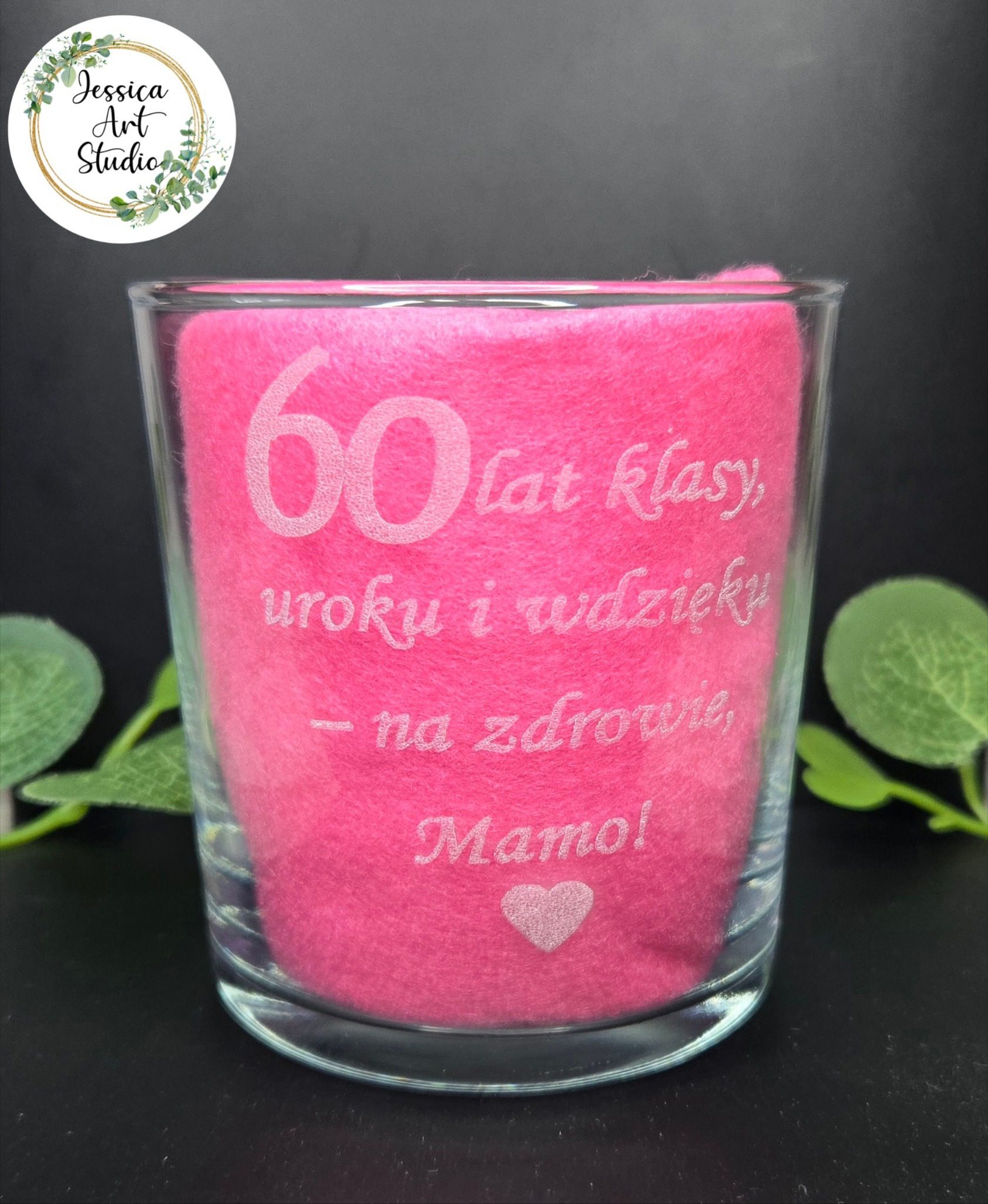 Stylowa szklanka z grawerem „60 lat klasy, uroku i wdzięku – na zdrowie Mamo!” to wyjątkowy prezent, który łączy elegancję z ciepłem rodzinnych uczuć. ![]()