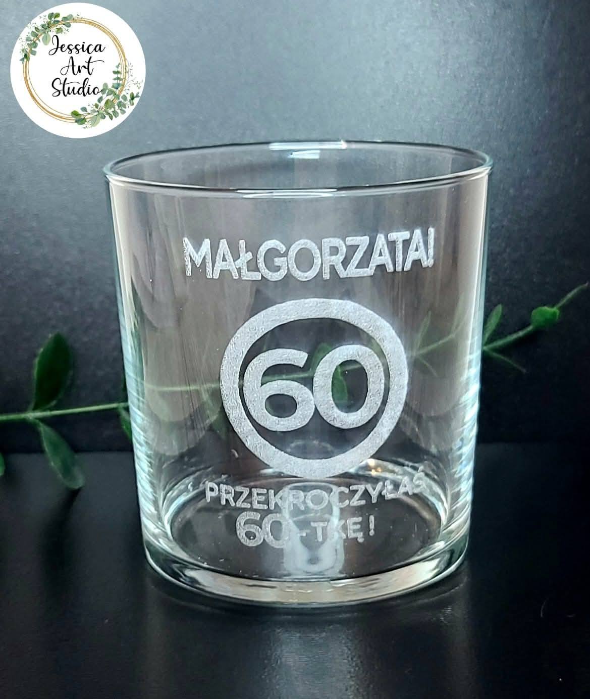 Stylowa szklanka do whisky z humorem! 🥃 Personalizowana imieniem i wiekiem – idealny prezent na 60-tkę dla kobiety, która lubi świętować z klasą.